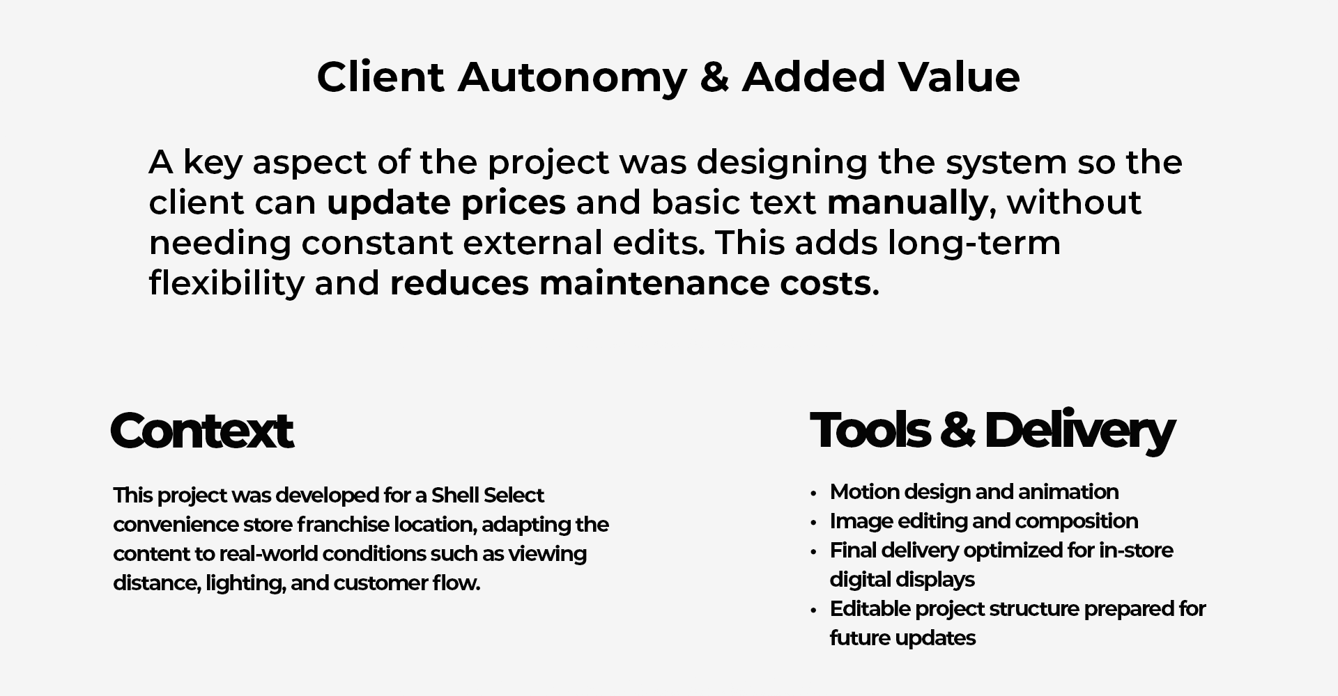 Comprehensive redesign and motion graphics development for a Shell Select franchisee in Argentina (Combusplata S.A.). The project focused on transforming static in-store communication into a dynamic digital experience, enhancing visual hierarchy and appetite appeal for food offerings. Key Highlights: -Visual Modernization: Clean-up and enhancement of store imagery to create a premium architectural feel. -Dynamic Menu Boards: Transition from static prices to animated, high-contrast layouts for better readability at a distance. -Brand Consistency: Implementation of global Shell Select guidelines tailored for local franchise needs. -Modular Content: Development of a flexible system for easy price updates and promotional rotations. Client: Combusplata S.A. | Brand: Shell Select Argentina.